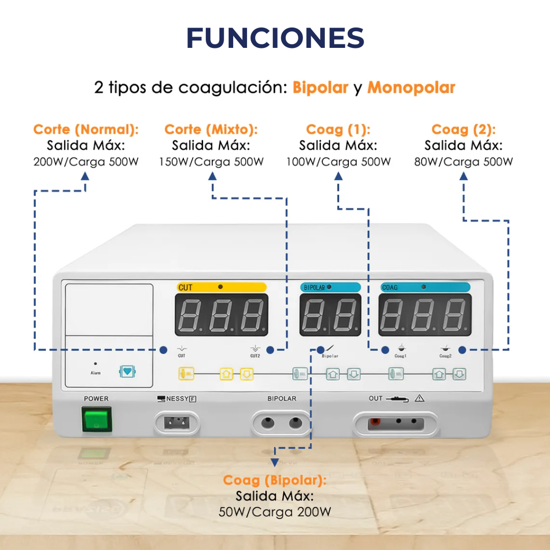 - Modos de uso: Corte, Corte Mixto, Coagulación (3 modos) y Bipolar