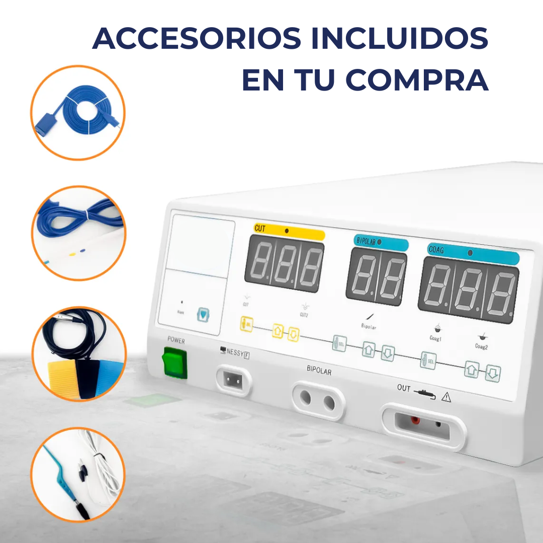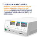 - Modos de uso: Corte, Corte Mixto, Coagulación (múltiples niveles) y Bipolar